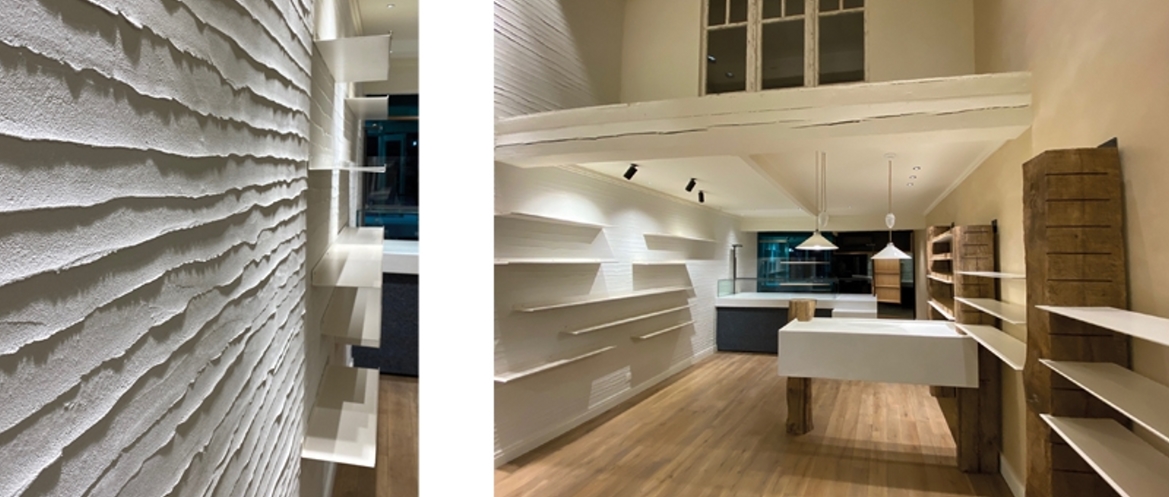 L’enduit décoratif est conçu et réalisé spécialement pour ce client, un panel de prototypes de matières est donc nécessaire pour passer de l’intuition de l’architecte à la réalisation : le mur gourmand en coulures blanches devient dentelle.