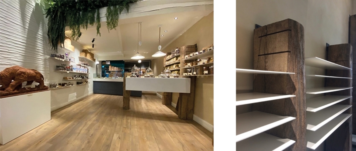 Pour cette boutique de chocolat artisanal, nous avons sélectionné des matières nobles et faites main : écorce, badigeon à la chaux, bois ancien de réemploi, enduit décoratif… Autant de recherches nécessaires à un concept architectural sur-mesure.