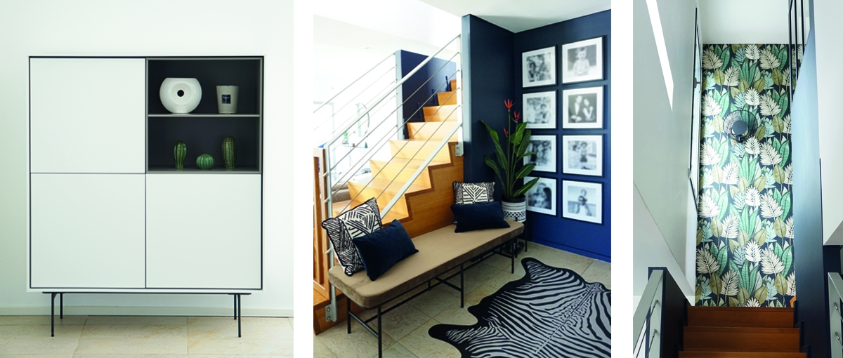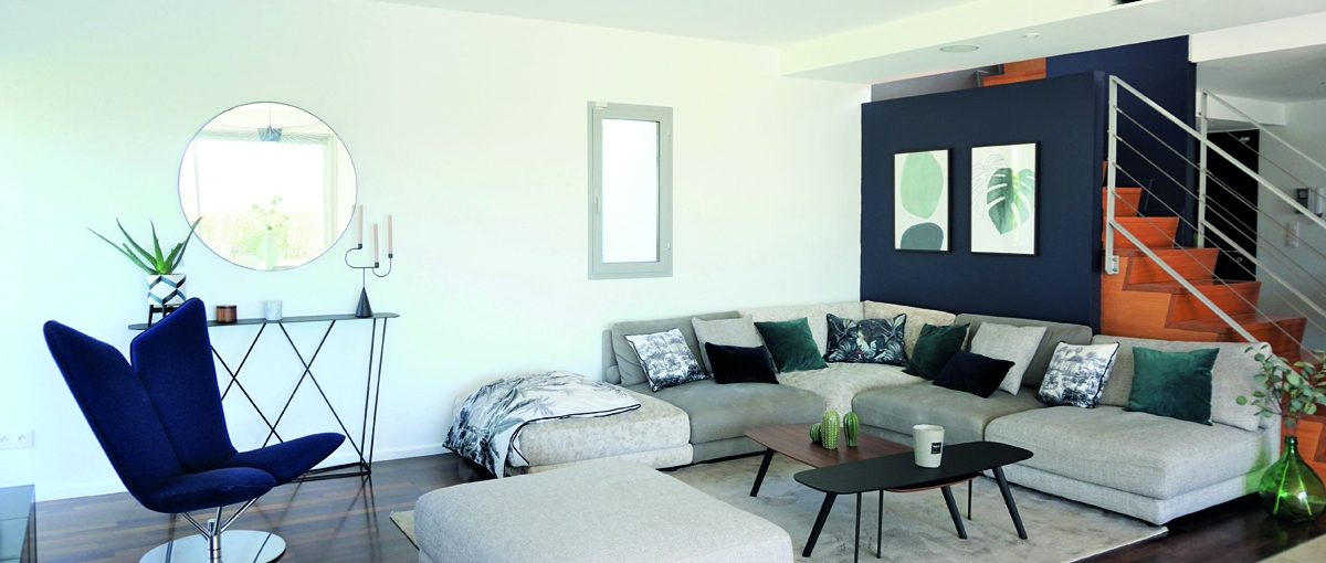 J'ai ainsi repensé leur bel espace de vie afin de créer l'harmonie entre l'entrée, le salon, la salle à manger et la cuisine ouverte, en jouant sur les couleurs, les tissus et les matériaux, tout en apportant davantage de chaleur. La teinte bleue (déjà présente sur un des murs du salon) a été le fi l conducteur du projet, à laquelle j'ai associé le vert, le taupe et le noyer. Ces tonalités se poursuivent dans la cage d’escalier avec le papier peint aux grands feuillages verts et bleus Sabal (Casamance) qui crée le lien entre le séjour et la chambre d’amis à l’étage.