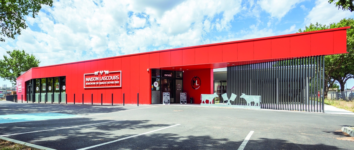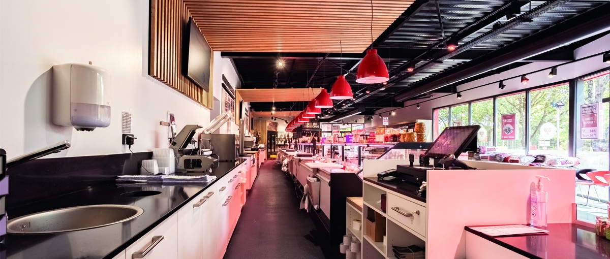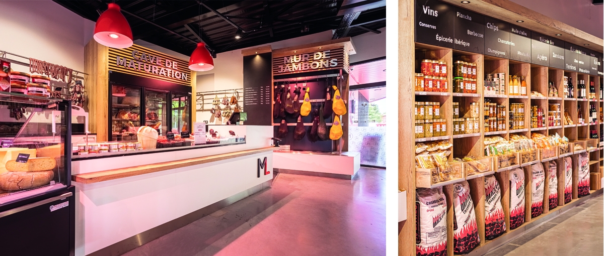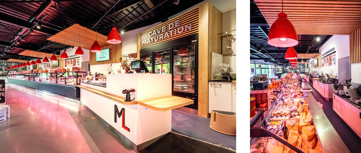 On apprécie aussi la généreuse vitrine qui présente de nombreux produits régionaux mais aussi de l’épicerie fine, du vin. Les amoureux de la terre seront sensibles à la vitrine qui permet de visualiser les viandes à maturation mais aussi à l’espace dédié à la rôtisserie ! Des panneaux en ardoise distillent savamment une touche vintage et font écho à la façade teintée de rouge en métal laqué époxy, aux couleurs locales et qui viennent en toute subtilité, avec une arche, souligner l’entrée.