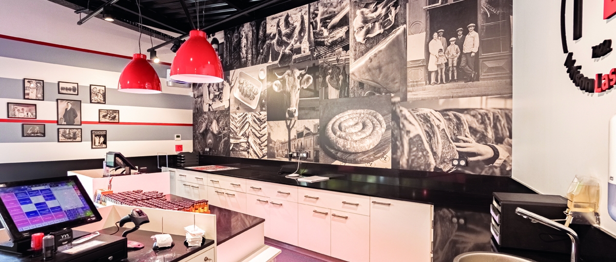 La couleur rouge rappelle symboliquement les produits de la boucherie alors que le bois donne une ambiance chaleureuse. Sur un mur, c’est un clin d’oeil au fondateur de la boucherie qui est donné grâce à de jolies photos en noir et blanc. Des touches de noir ont aussi été choisies car indispensables et évidemment tendance.