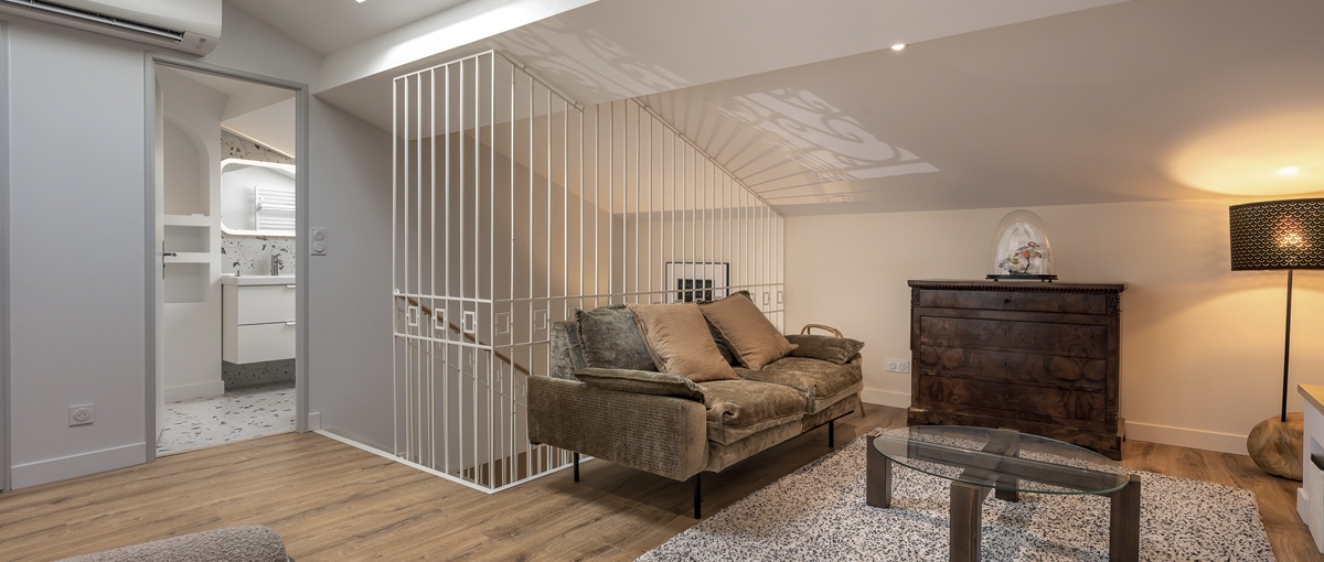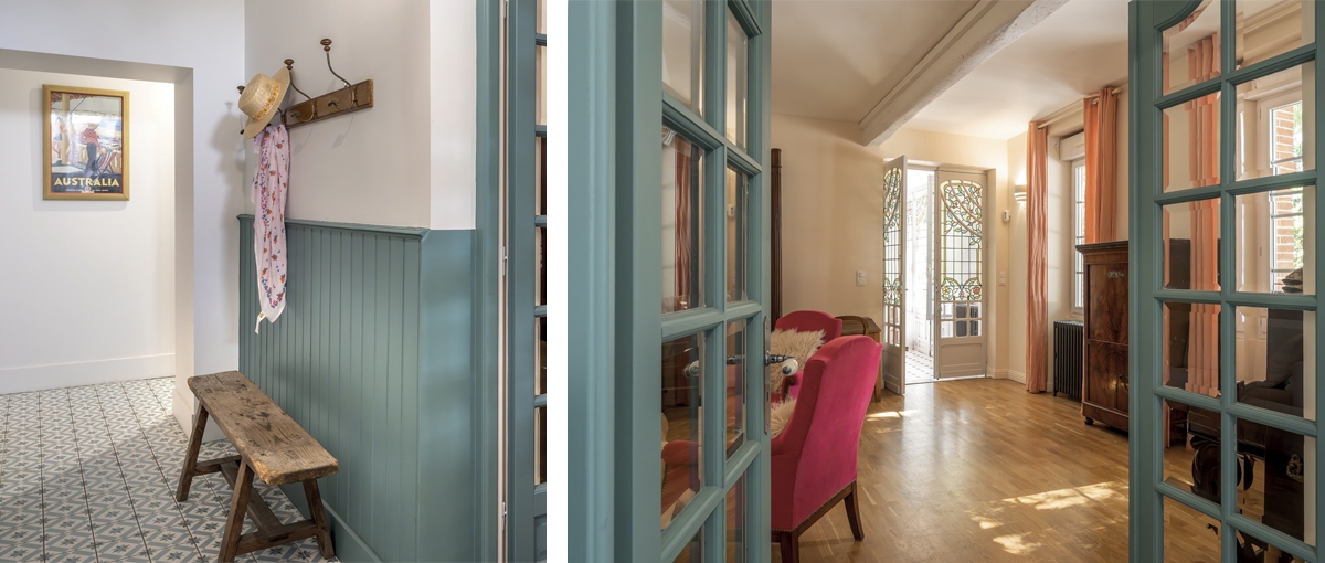 Rénovation complète d'une maison transmise de génération en génération. La première étape consistait à la réhabilitation de l'ensemble du rez-dechaussée : remise aux normes électriques, chauffage, cuisine, salles de bain avec création d'un bureau dans l'ancien garage. Confort, isolation, une touche de modernité tout en mettant en valeur les matériaux anciens conservés : ponçage et vitrification du parquet, reprise de la cheminée, mise en valeur des portes de style Art Nouveau et pose d'un carrelage à cabochons. La seconde étape comprenait l'aménagement complet d'une partie du grenier de la maison : création de deux chambres, d'une salle de bain et d'une mezzanine. Chaleur des matériaux et des couleurs dans le respect du style du rez-de-chaussée. Création d'un escalier 2/4 tournant à limon central en acier, marches et main courante en chêne massif. Réfection de la façade, rejointement de briquettes et pose de lambrequins.