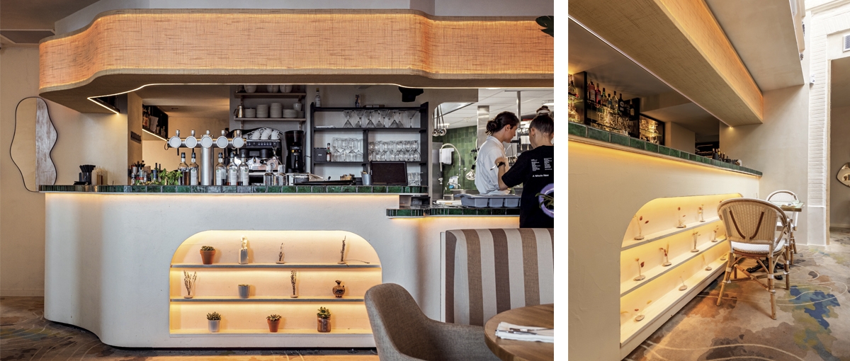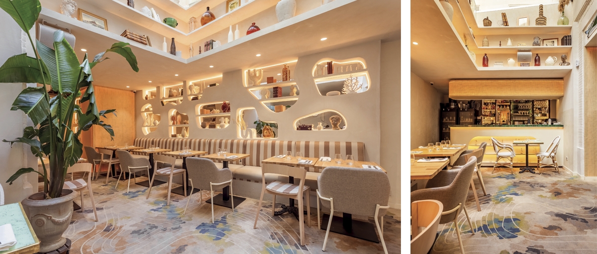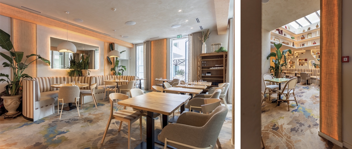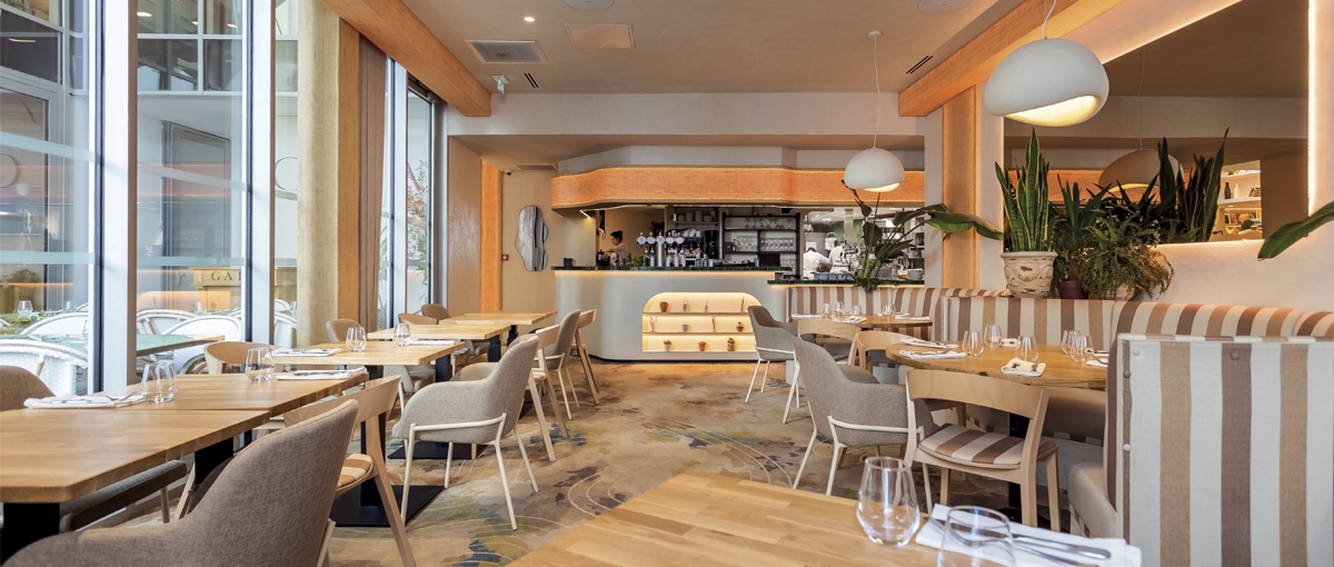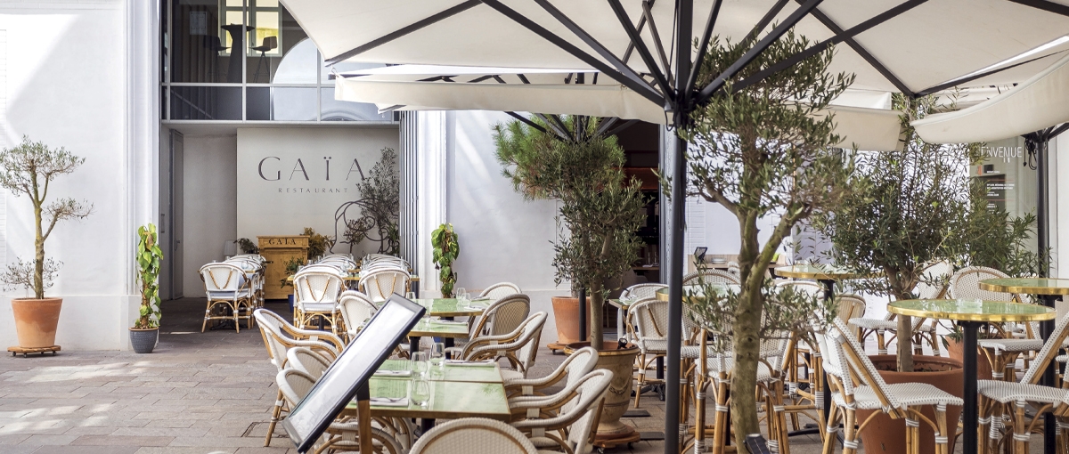 C'est dans un cadre privilégié au sein d’un hôtel particulier, 24 rue Croix Baragnon à Toulouse que Gaïa est né. Pour ce restaurant, une véritable Odyssée de 32 semaines allait avoir lieu ! Contraintes d’organisation et de planification en travaillant au centre-ville, à la même période que les travaux de rénovation de la rue de Metz et de la rue Croix Baragnon. Respect du cadre prestigieux de cet endroit historiquement chargé. L’envie des 4 associés de créer un lieu chic et chaleureux permettant le dépaysement à travers des choix fort en décoration et en aménagement. Gaïa c’est avant tout un choix de matériaux pour le sol avec une moquette créée pour l’occasion, des banquettes en tissu rayé du plus bel effet, des murs à la chaux agrémentés de paillage naturel rappelant les voyages dans les îles Grecques. Le travail sur les niches, les jeux de miroirs et de lumières permet de créer de la profondeur et participe à la sensation de cosy ressentie dans Gaïa. Dans cet univers, le bar tout en ondulation demeure un pièce maîtresse, il faut saluer le travail de l’ébéniste et de l’artisan mosaïste qui ont relevé ce défi. Merci à Thomas, Julien, P