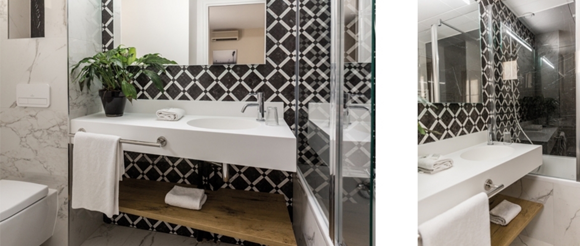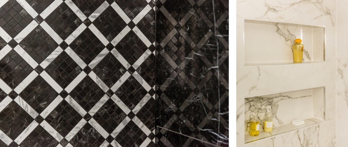 Côté décoration, les pièces sont mises en valeur par un sublime carrelage imitation marbre dans les tons de blanc et de noir, positionné en fonction de la géométrie des pièces afin de donner une perception de grandeur. Une magnifique mosaïque réunissant ces deux teintes apporte le cachet escompté. La touche de bois rend l’espace chaleureux et s’harmonise parfaitement avec le côté naturel du marbre, tout en créant des rangements astucieux.