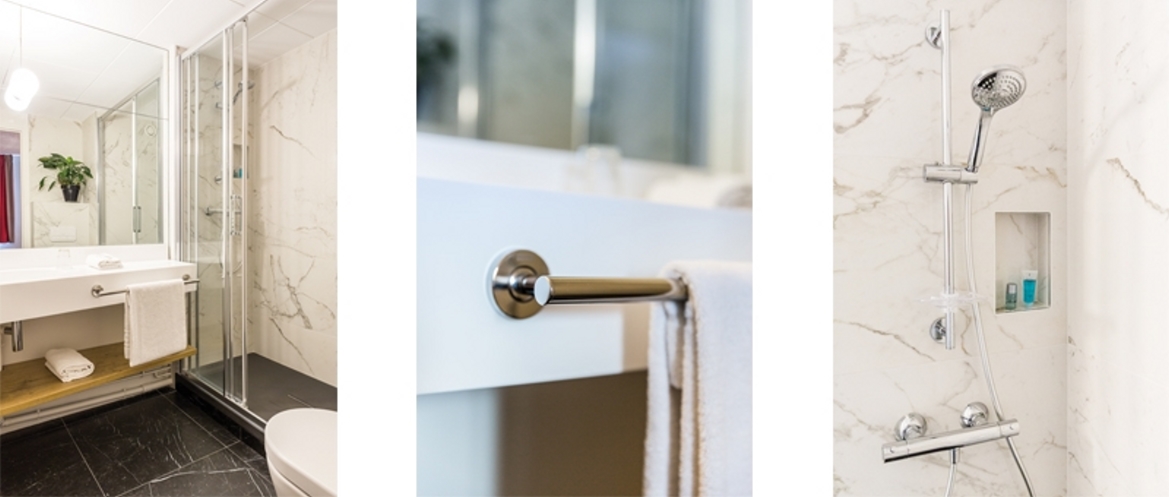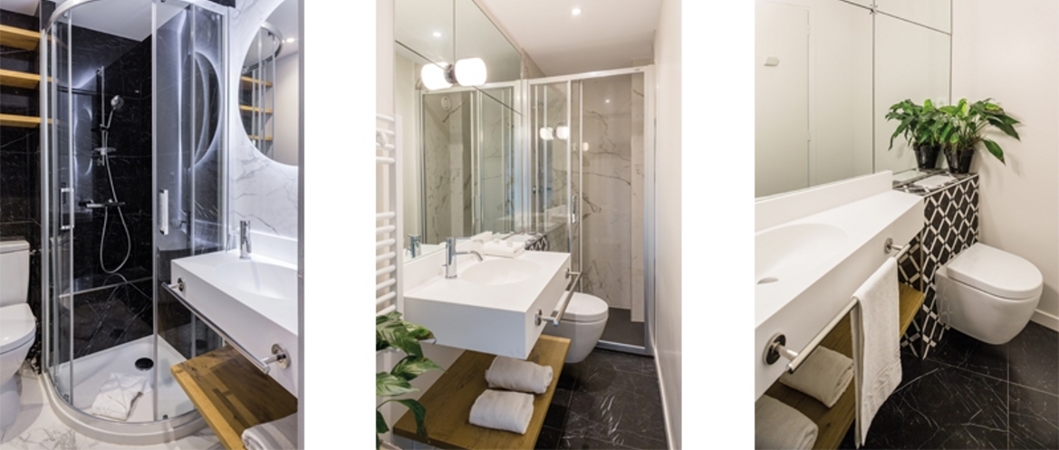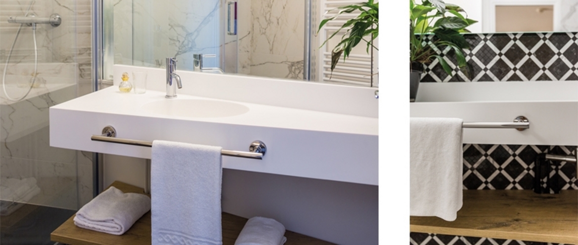 L’idée du projet a donc été d’optimiser au maximum les espaces en intégrant des niches et des tablettes en lien avec les équipements sanitaires. En considérant les contraintes techniques et les normes d’hôtellerie, il a été intégré des commodités et des plans vasques suspendus. Les vasques ont été réalisées sur-mesure par rapport aux murs afin de conserver un maximum d’amplitude devant. Les parois de douche réalisée sur-mesure également permettent d’optimiser le passage tout en protégeant des projections.