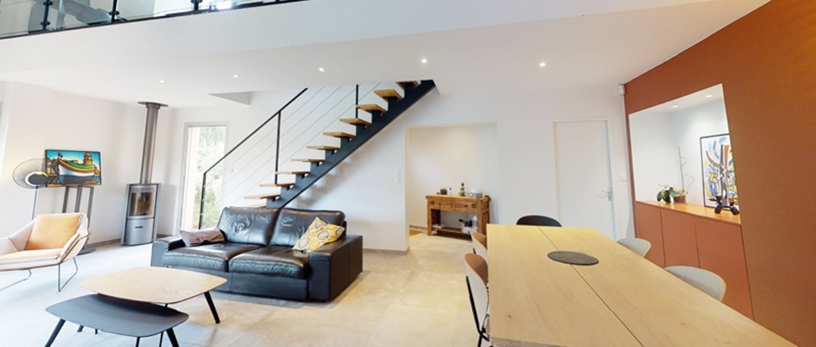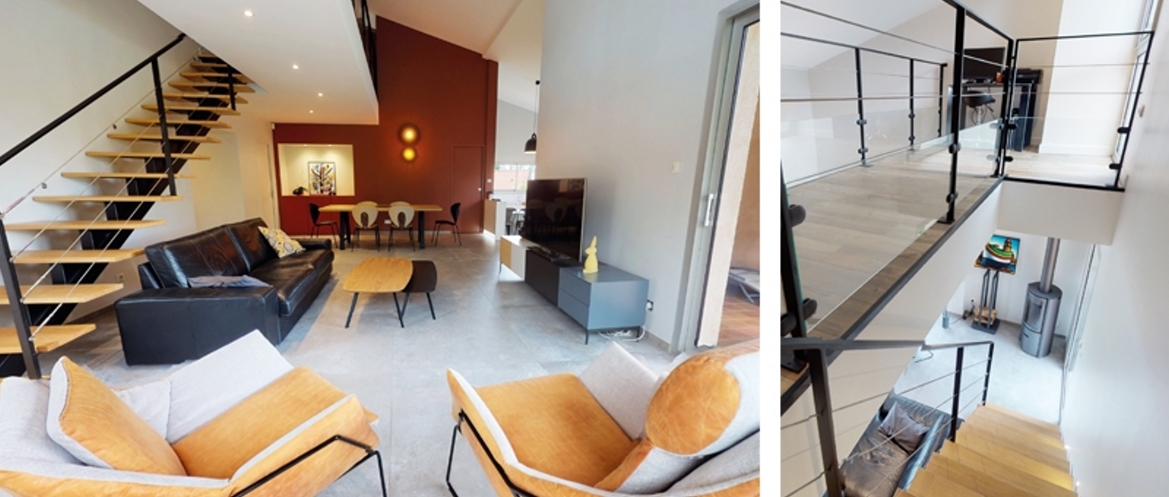 Les propriétaires souhaitaient un style industriel que nous avons souligné par un escalier en bois et ferronnerie, le carrelage aspect béton accentue également le style.