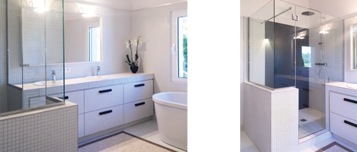 Dans une maison familiale en campagne toulousaine, réhabilitation complète de la cuisine et de la salle de bains principale.