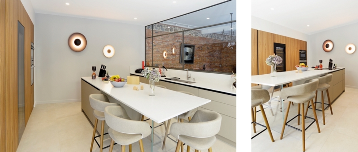 Le travail, au rez-de-chaussée, s’est essentiellement dirigé sur le changement des revêtements de sol, abîmés par le temps, et par la refonte complète de la cuisine. Elle s’est dotée d’un linéaire en Fenix, d’un îlot central semblant flotter avec son jambage en verre ainsi que de grands rangements aux façades en noyer révélant le beau et dissimulant le pratique.