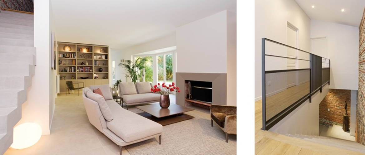 L’escalier a été recouvert d’un béton décoratif couleur zinc. Cette teinte crée le lien avec la tonalité des dalles du séjour, en grès cérame, posées en format XXL.