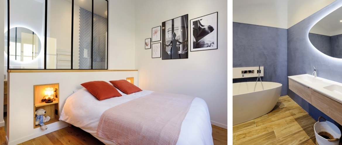 Résultat : une petite salle d’eau vitrée sur la chambre aux tonalités poudrées, une salle de bains rhabillée en béton Bleu Pétrole et une dernière, parentale, très épurée dans des tons tabacs et gris fumés.
