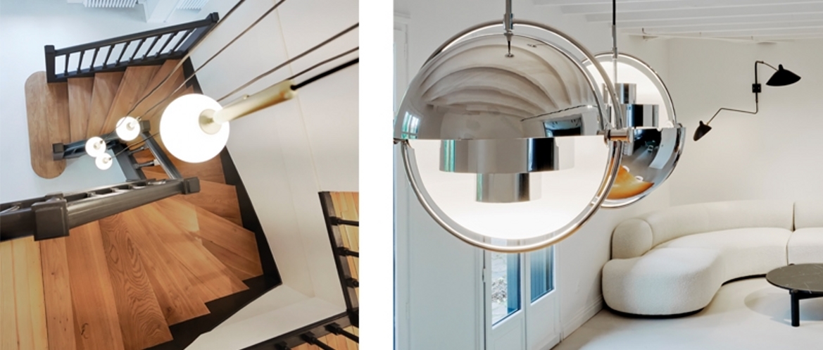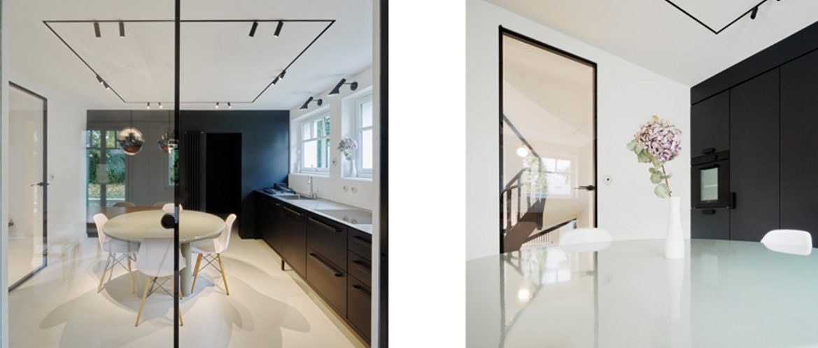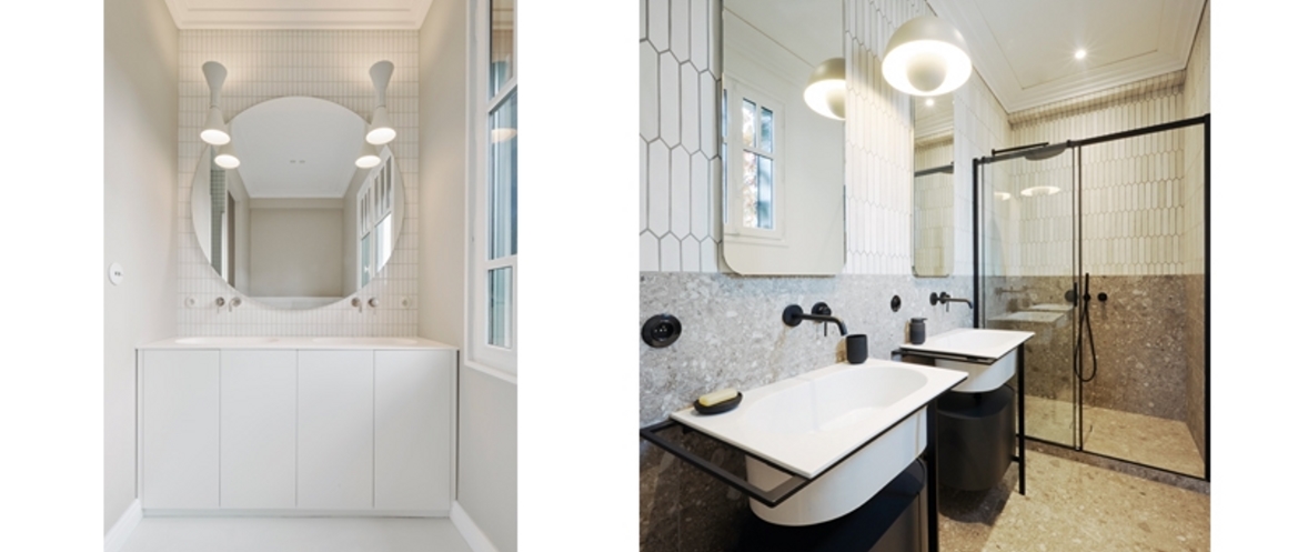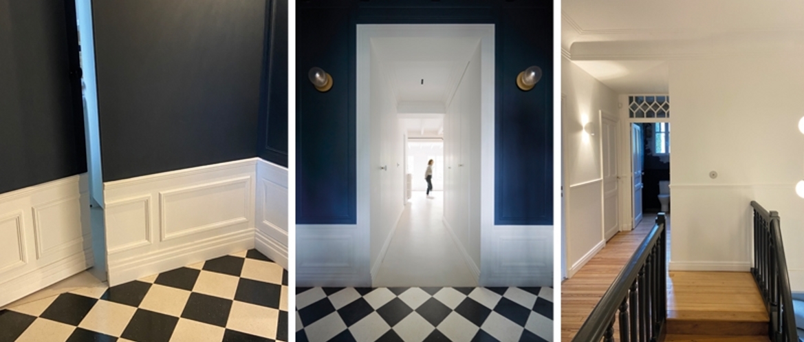 C'est un projet contemporain avec des clins d'oeil Art-Déco : moulures, rambarde de l’escalier, porte secrète à l’ancienne vers la buanderie. Le carrelage existant en damier noir et blanc de l’entrée a également servi de base d’inspiration. Sur ces grands aplats blancs et noirs nous avons apporté de la matière, notamment dans les salles de bain avec le mixte petits carreaux/granito, du relief, grâce à l’apport de moulures, corniches, cimaises et de la lumière avec la création de verrières comprenant des petits bois typiques années 30.