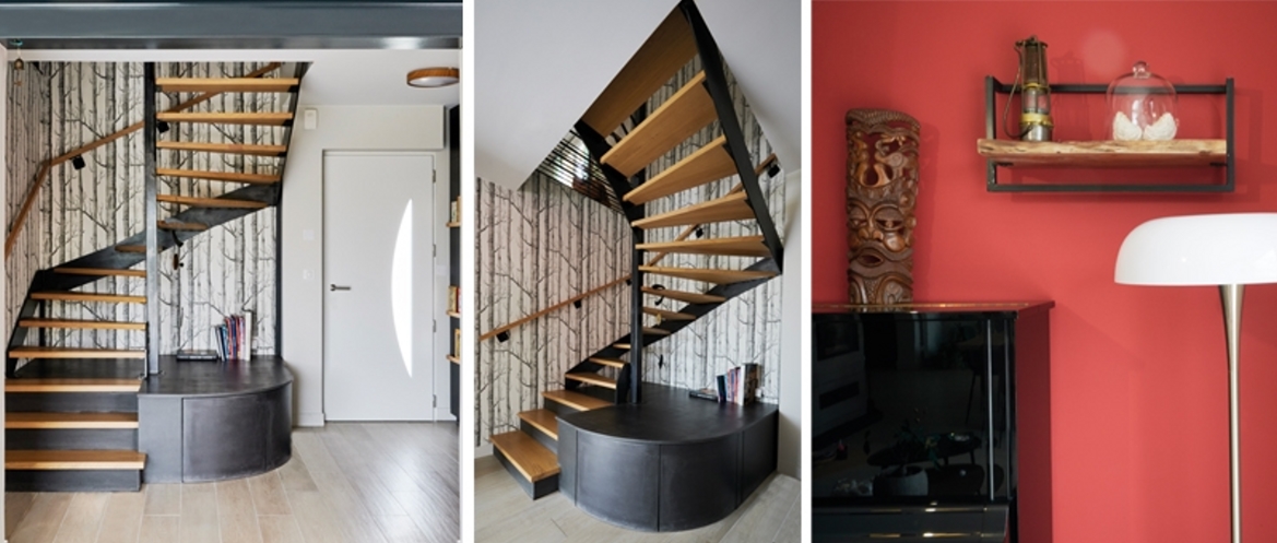 L’entrée avec la cage d’escalier a complètement était repensée, changement de sens pour l’escalier (amélioration des circulations) et agrandissement de l’ouverture entre l’entrée et le salon afin de créer une entrée plus majestueuse et lumineuse.